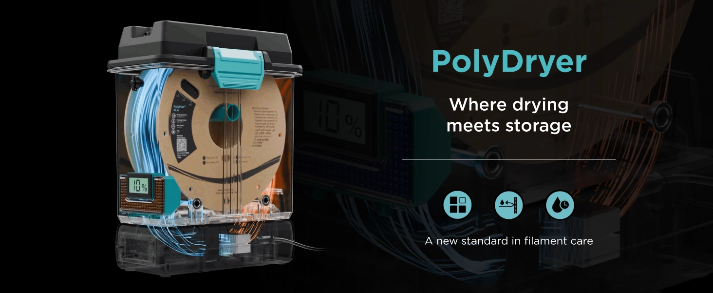 El PolyDryer de Polymaker es una solución 2 en 1 para el secado eficiente y el almacenamiento seguro de filamentos. Este secador de diseño modular ofrece un sellado excelente y mantiene la humedad completamente alejada de tus bobinas de filamento. Un flujo de aire de 360°, con 3 niveles de potencia ajustables, garantiza un secado uniforme y eficiente de los materiales.