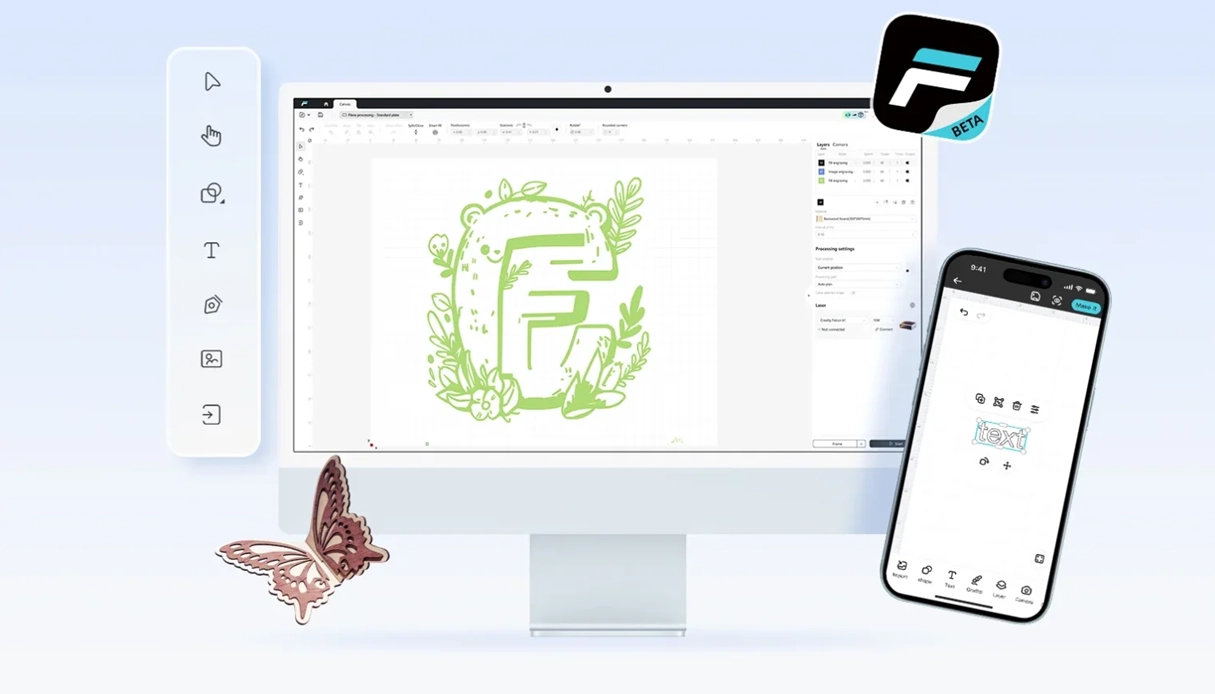 La aplicación Falcon Design te ofrece un control total desde tu smartphone. Supervisa el corte por láser en tiempo real, detecta inmediatamente riesgos de incendio y crea extraordinarios vídeos time-lapse de sus proyectos, todo a distancia.